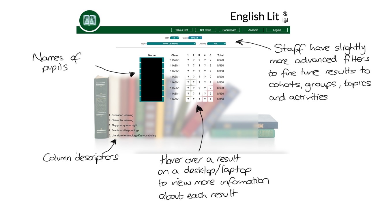 The PiXLit app contains 16 texts and a range of different activities to help strengthen the knowledge of those texts. The activities revolve around gaining a deeper understanding of quotations through testing memory recall of the quotes, reciting who said the quote or who the quote was about, events and happenings and literature terminology. The PiXLit app holds true to the core PiXL principles of Diagnosis, Therapy and Testing by giving staff access to a range of visual representations of the outcomes of students engaging with the material.